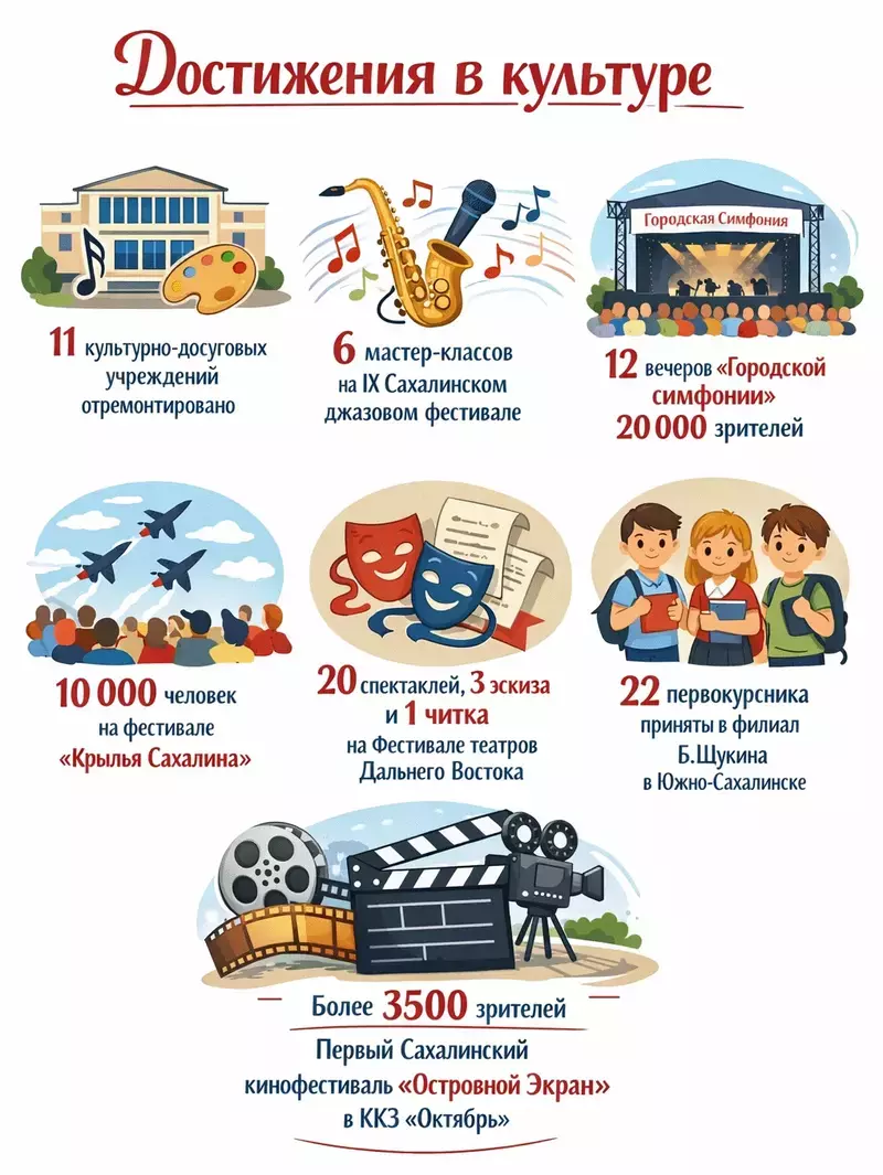 Напомним, что в 2025 году в Южно-Сахалинске прошел гала-концерт Всероссийского фестиваля «Своих не бросаем». Команда «Сделано на Сахалине» стала чемпионом Премьер-лиги КВН, островитяне удостоились «Большого КиВиНа» — одной из самых престижных наград в мире КВН. Танцевальный спектакль Сахалинской филармонии «Я вижу звезды» стал соискателем «Золотой маски», островной детский оркестр выступил на Красной площади в фестивале «Спасская башня детям».
