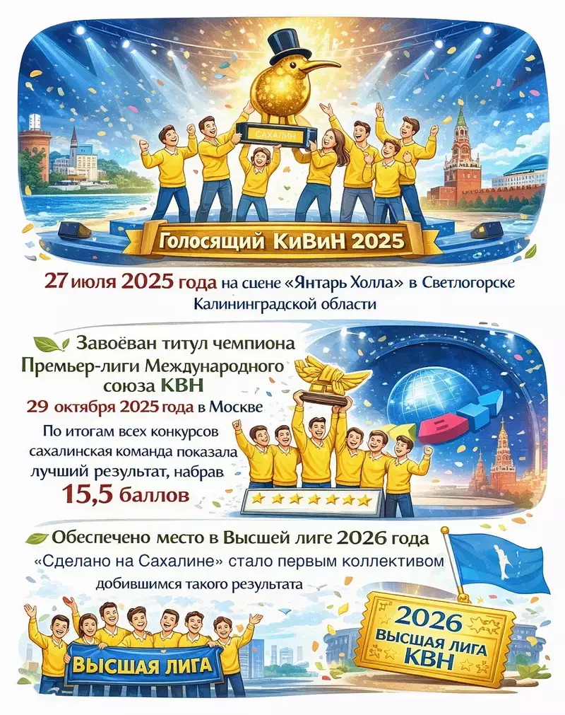 Команда «Сделано на Сахалине» стала чемпионом Премьер-лиги Международного союза КВН и завоевала Большого КиВиНа на фестивале «Голосящий КиВиН». Так, островной регион официально подтвердил свой статус одного из самых юмористических регионов страны. Пройдя путь от местной лиги до главных телеэкранов, сахалинцы доказали: юмор не знает границ.