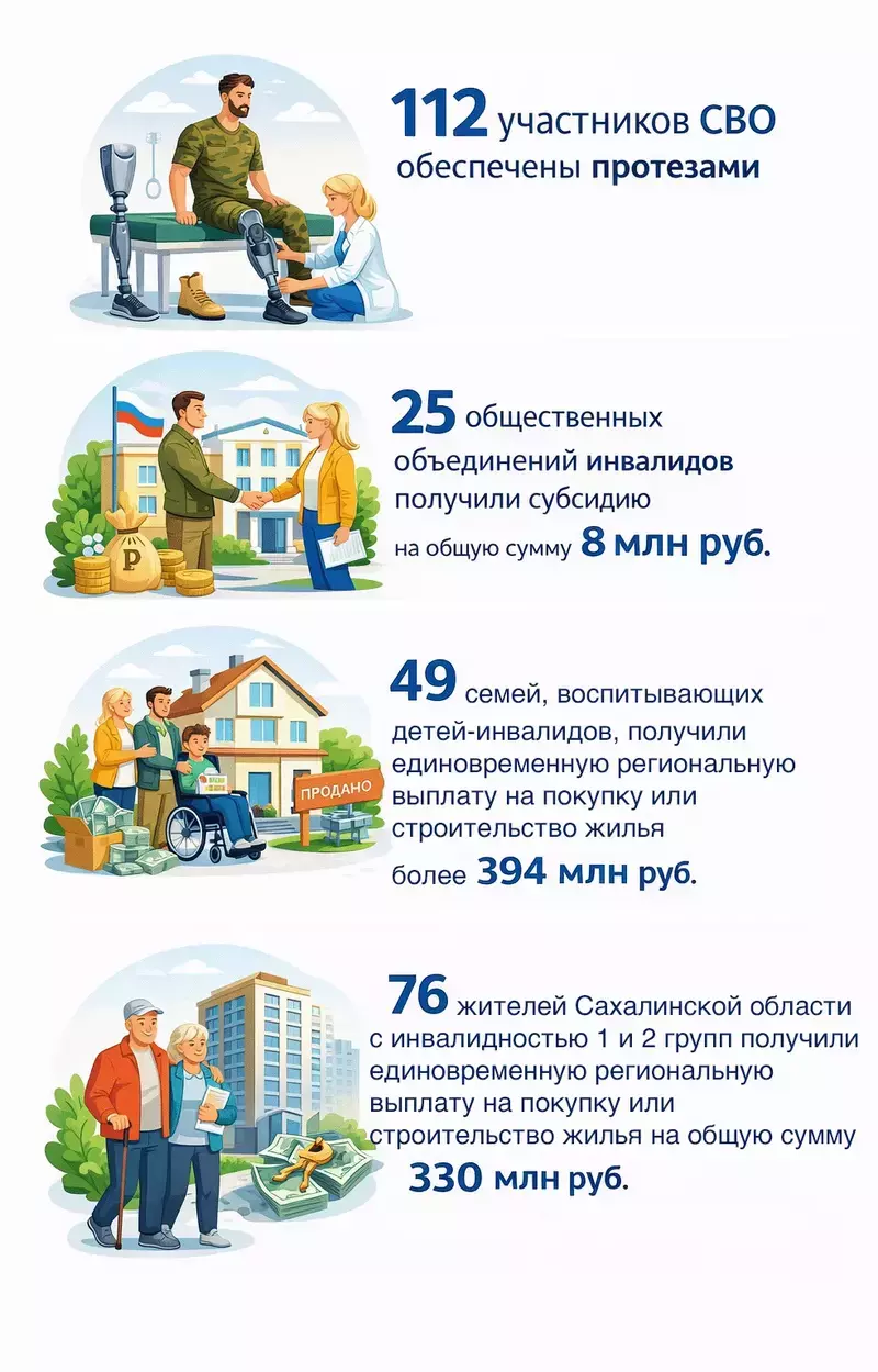 В Сахалинской области также реализуют региональные проекты в сфере поддержки инвалидов, аналогов которым нет в России. Например, каждый ветеран СВО на Сахалине и Курилах получает персональное сопровождение. Чтобы получить доступные льготы, им не нужно ходить по инстанциям - работает режим «одного окна».