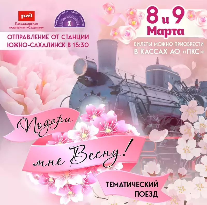 Весна – время пробуждения, обновления и, конечно же, праздников! И накануне Международного женского дня, 8 и 9 марта, приглашает всех окунуться в атмосферу весеннего волшебства на борту уникального тематического поезда – «Подари мне весну!». Он следует по маршруту Южно-Сахалинск - Корсаков- Южно-Сахалинск.